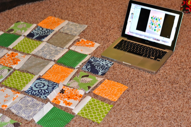 3) Arrange your charm squares on point (like a diamond) in a color arrangement that’s pleasing to you, with the white stripes resting between adjacent blocks. If you used a design wall to arrange the blocks, you can refer to a photo for block orientation. Arrange the squares without the stripes toward the ends of the rows, as pictured.