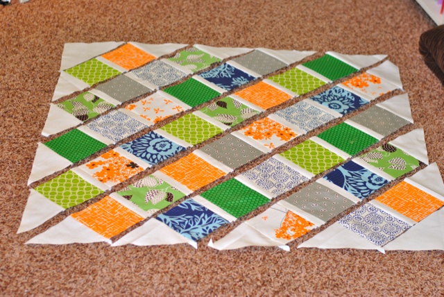6) Place the larger rectangles in opposite corners of the quilt, Should be larger triangles.
